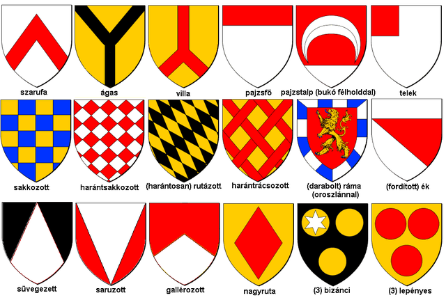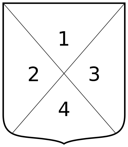 Többféle osztóvonal együttes használatával kombinált osztások jönnek létre. Ezek közül a leggyakoribb az egy vízszintes (vágás) és egy függőleges (hasítás) osztóvonal által létre jövő négyelt pajzs. Az osztóvonalak természetesen ebben az esetben is nagy alaktani változatosságot mutathatnak. Ilyen például az itt látható, hermelinnel és vörössel, vízszintesen fűrészesen négyelt pajzs.