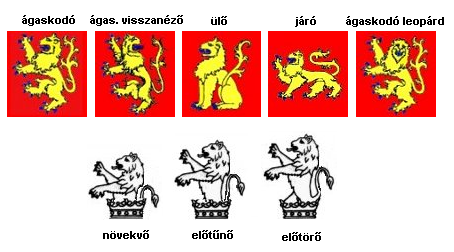 Az állatok heraldikai ábrázolása is lehetett egész alakos, képviselhette az állatot valamely levágott/letépett testrésze, vagy igen gyakran az állat úgynevezett fegyverzete (csőr, karom, fog, agyar, agancs). A nem teljes állatalakok lehetnek előbukkanók (testük egyharmada látszik), növekvők (a test fele látszik) és előtörők (a test kétharmada látszik). A részleges megjelenés terminológiájára más kifejezéseket és felosztásokat is lehet találni. Emellett természetesen számos mozgásforma is megörökítésre kerülhet: repülés, zuhanás, állás, ülés, lépés, ágaskodás, stb.