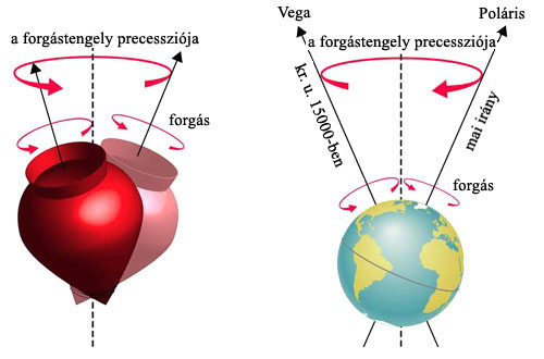 Az időmérés mértékegységévé váló különböző bolygómozgások említett periodikus jelenségei mellett szót kell ejteni a Föld még egy periodikus mozgásáról, a precesszióról. A Földet a tengelye körüli forgás és a Nap körüli keringés mellett harmadikként egy a búgócsigákéhoz hasonló imbolygó mozgás is jellemzi. Ismert, hogy a Föld nem szabályosan gömb alakú, hanem ellipszoid, azaz az egyenlítő mentén kidudorodik, a sarkoknál pedig kissé belapul. Az egyenlítő és a sarkokon átfutó pólusvonal hossza között az előbbi javára kb. 43 kilométeres eltérés van. A Föld tengelyének dőltsége következtében a Nap gravitációs hatása másként érvényesül a hozzá közelebb eső dudorra, mint a távolabb lévő lapított részekre, ami úgy jelentkezik, hogy a Nap és a Hold is erős vonzást gyakorol az egyenlítői tömegtöbbletre, és a dőlt forgástengely irányát a keringési síkhoz igazítani igyekezve a tengelyt felállítani törekszik. Ezen erőhatások következtében a földtengely egy kúpalakot kirajzoló mozgásba kerül, amelynek iránya ellentétes mind a Föld forgásirányával, mind pedig a keringésével.