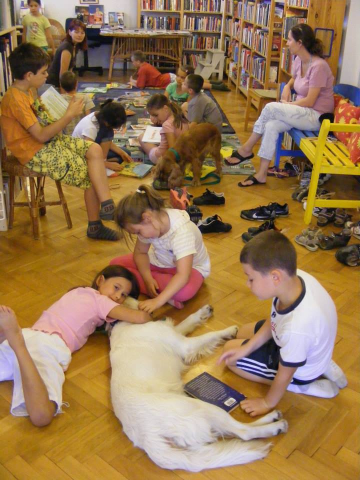 9.6.3.ábra. Nyári tábor. Könyvtárban a terápiás kutyákkal.