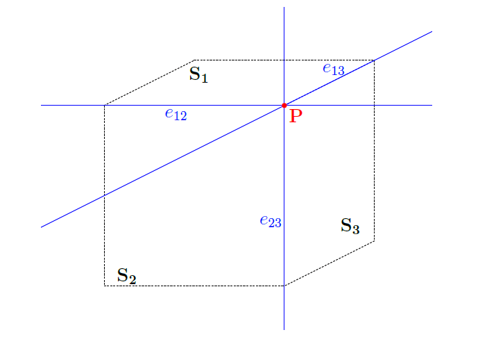 1.1. gyakorlat. Mutassuk meg, hogy ha három sík közül bármely kettő egy egyenesben metszi egymást, és a metszetegyenesek közül valamely kettő egy