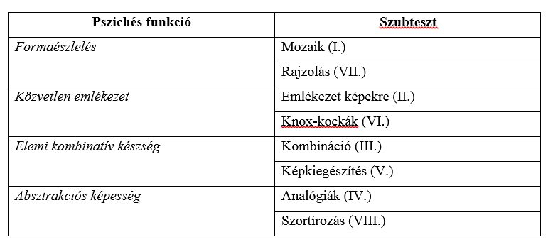 A mért pszichés funkciók és nyolc szubteszt a következő, 8.1. sz. táblázatban ismertetjük: