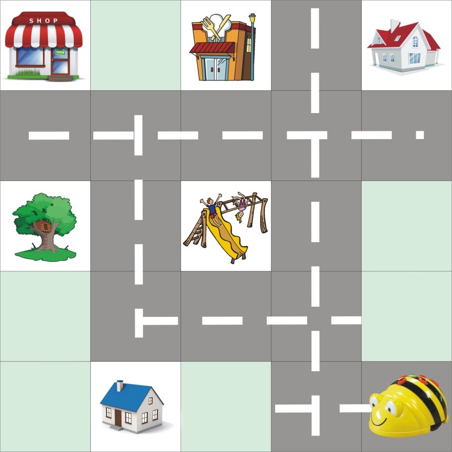 Mi magunk is készíthetünk gyakorlópályát a robotnak, ami akár életszerű is lehet, például egy térkép, amin van zöldséges, játszótér, óvoda, gyerekek házai. (Természetesen figyeljünk arra, hogy a robot pontosan 15 cm-t lép.) Vegyük az alábbi térképet: