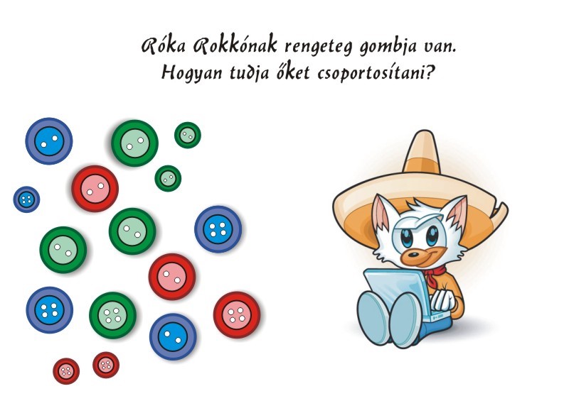 A feladat, hogy segítsünk Róka Rokkónak szétválogatni a gombjait, a szempont a gyermek saját ötlete, azaz például azt mondja, hogy először színek szerint válogat, majd újra kezdi és másodjára méret szerint válogatja őket szét. A játék egy „open-ended” játék, azaz több különböző jó megoldás is születhet. A gyermek tetszőlegesen válogathat és az ellenőrzést a pedagógussal együtt kell megtenni. Hibás csoportosítás estén, a „Miért ebbe a csoportba tetted?” kérdéssel kezdeményezhetjük a javítást.