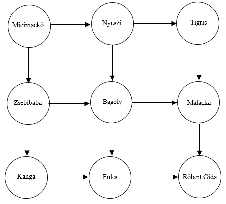 1. példa: Micimackó otthonából indulva a legrövidebb úton akar eljutni Róbert Gidához úgy, hogy közben három barátját meglátogatja. Játsszuk le az összes lehetséges útvonalat, és rajzoljuk be egy-egy ábrába!