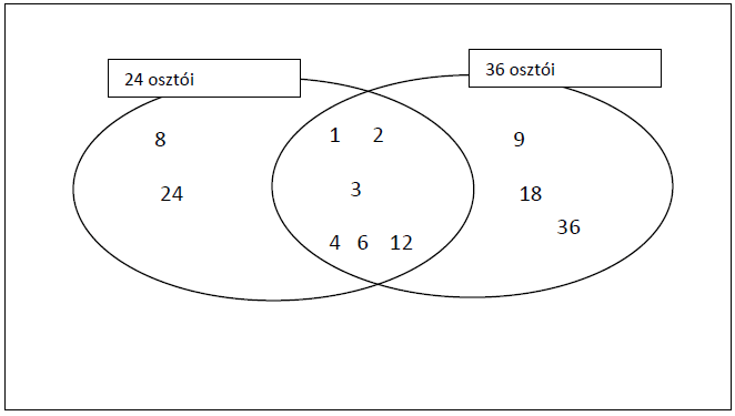 Halmazábrán ábrázolva a 24 és a 36 osztóit leolvasható a legnagyobb közös osztó.