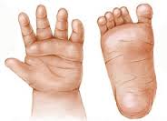 Az fejen jól látható jegy a lapos orrgyök, kicsi orr, elálló fülek, mongoloid vonások: ferde vágású, egymástól távol eső szemek, egyenes haj. A végtagjaik rövidek. A tenyéren megjelenhet a négyujjredő. A nagylábujj és a mellette lévő közötti rés nagyobb.