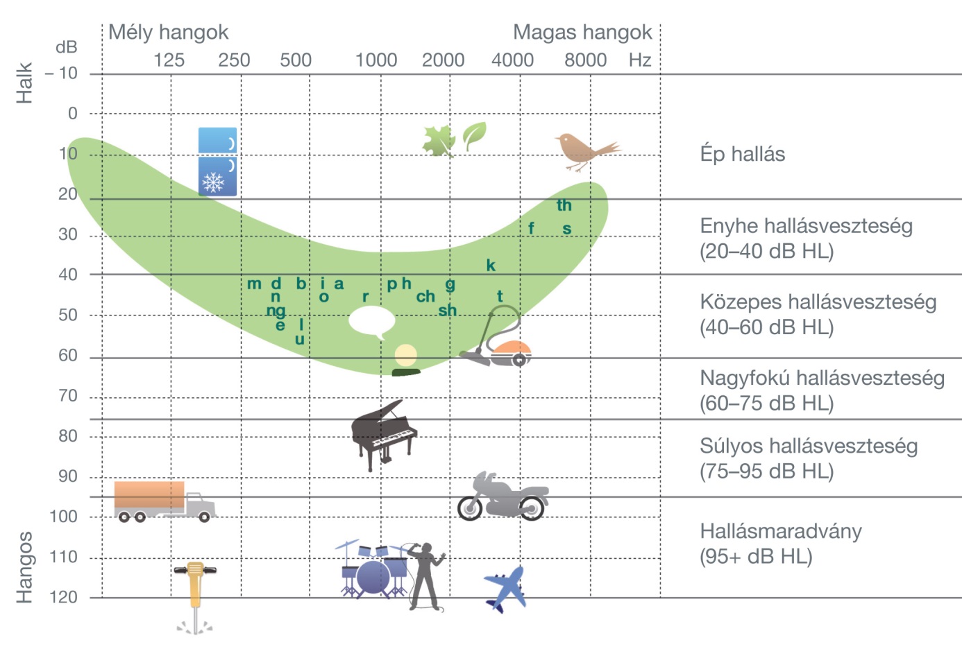 A hangerő csökkent érzékelése szempontjából a következő kategóriák állíthatók fel a jobbik fülön, a főbb beszédfrekvenciákon mért átlagos hallásveszteséget alapul véve: