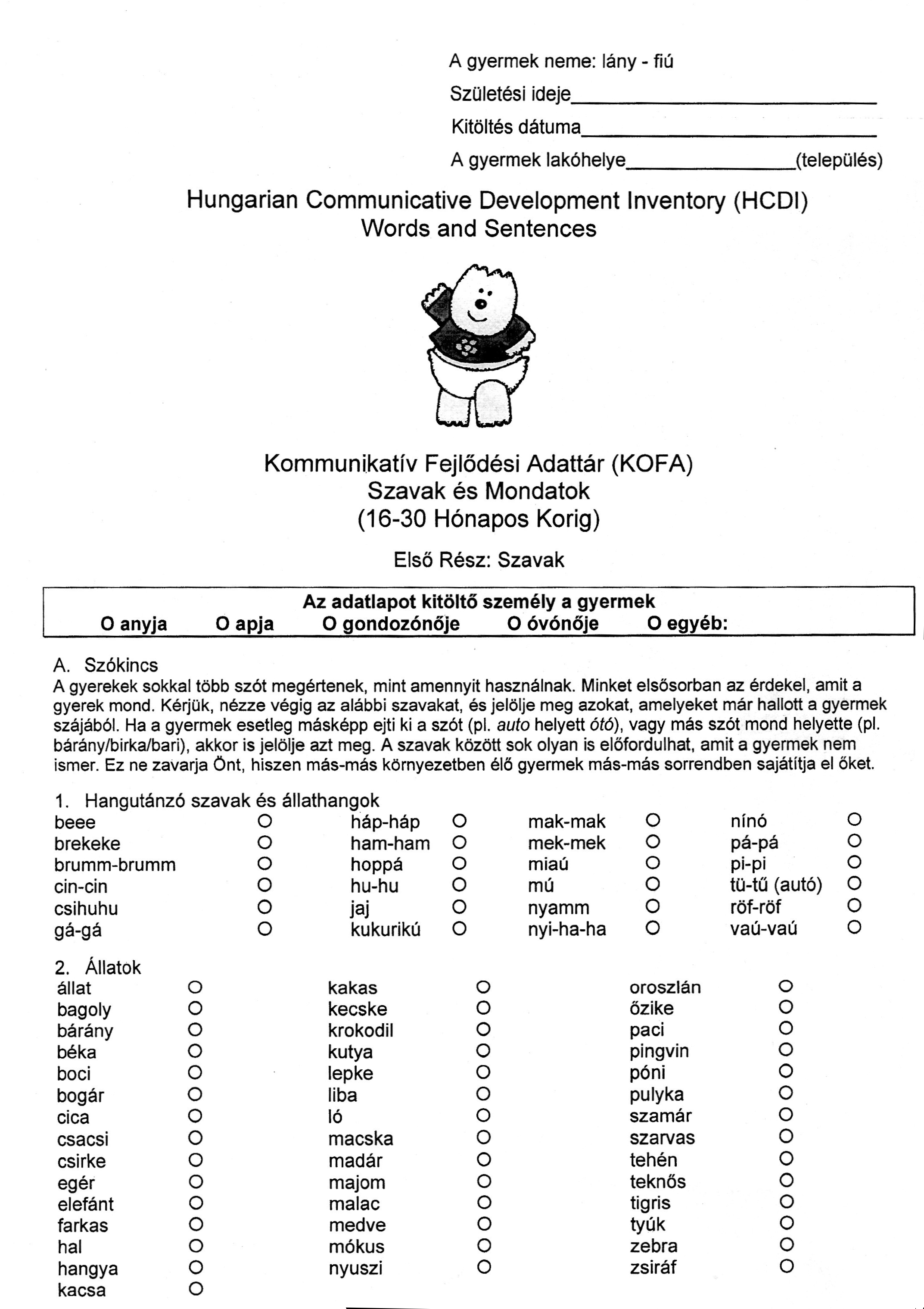 A MacArthur-Bates Communicative Development Inventories (CDI) – KOFA – Kommunikatív Fejlődési Adattár „szülői beszámolón alapuló korai nyelvfejlődési vizsgálóeljárás”, kérdőíves formában ad módot a szülők kikérdezésére a gyermekek aktív szókincsére vonatkozóan 16 és 30 hónapos kor között, a kérdőív a gyermek lexikai és morfológiai-szintaktikai fejlettségéről nyer adatokat. Az instrukciók egyszerűek, érthetőek, jól követhetőek, a szülőknek meg kell jelölniük azokat a szavakat (szókezdeményeket, torzított alakokat, gyermeknyelvi/dajkanyelvi) szavakat, melyeket „hallott már” gyermekétől – vagyis az aktív szókészletben az aktuális állapotig bármikor elhangzott, használt megnevezéseket a gyermek első szavainak megjelenésétől kezdve. Az „A” részben a teszt tematizálja a lexikális elemek csoportjait, pl. 1)„Hangutánzó szavak és állathangok”, 2) „Állatok”, (…) 7) „A test”, (…) 13) „Igék”, 14) „Igekötők”, 15) „Melléknevek”, 18) „Névmások”…, vagyis nominális (főnévi) elemektől verbális (igei) elemeken át grammatikai funkció-és absztrakt nyelvtani kategóriákig. Lehetőséget ad végmorfémák, végződések, idő-és helyjelölők használatának feltárására, a „B” részben ragozott szavak és a „C” részben szóvégződések jelölésén keresztül a rendhagyó alakok, tőváltozatok és illesztett morfémák helyes vagy helytelen használatára deríthet fényt. A „D” rész utal a gyermekek megnyilatkozásainak elemszámára – pl. hogy a holofrasztikus, a telegrafikus vagy az összefüggő önálló tartalmas beszéd fázisában van-e a kérdőív kitöltésekor a gyermek.