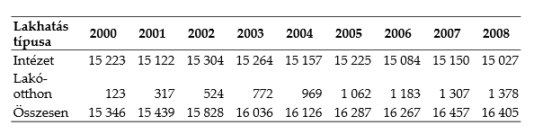 A táblázatban megjelenített 2008-ig visszamenő adatok azonban további elemzést kívánnak. A lakóotthonok közel fele a totális intézmények területén, a totális intézményeket oly gyakorta körülvevő falakon belül helyezkedik el, a nagy intézetek struktúráival továbbra is konfrontálva az ott élő személyeket (Verdes 2009). E helyzet kialakulása szorosan köthető az első magyarországi kitagolási törekvésekhez (lásd 8 fejezet).