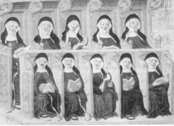 A kolostori élet szigorú szabályait követő és a zárda magányában „klauzúra” alatt élő női szerzetesrendek mellet a középkor későbbi évszázadaiban kialakultak a világi élet felé nyitottabb, oktatást, betegápolást és egyéb karitatív tevékenységet végző „világi” női rendek is. A női rendházak a középkorban egyébként sem voltak képesek – és nem is állt szándékukban – felvenni valamennyi oda belépni szándékozó leányt és asszonyt. A rendek java része exkluzív jelleget öltött, tehát csak nemesi származású nők léphettek be, és nekik is az előírásoknak megfelelő „hozománnyal” kellett hozzájárulniuk a szerzetesközösség anyagi alapjainak biztosításához. Így hamarosan tekintélyes vagyonnal rendelkező apácarendek jöttek létre, amelyek azt megengedhették maguknak, hogy könyvtáruk állományát folyamatosan gyarapítsák, ezáltal teremtve meg a szerzetesnők számára a képzés és önképzés lehetőségét. A városi konventek[1] – amelyeknek egy része ú. n. „kolduló rendként” működött – már tehetős városi polgárcsaládok leányait is felvették maguk közé, de a jelentős mértékű anyagi hozzájárulást ők is elvárták.