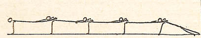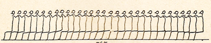 6-14 students stand in a line at body length distance from each other, they are in straddle position. Everyone bends forward while reaching back his/her hand, with his/her right hand grabs the student’s hand that stands in front of him/her. Without letting the hand go off they walk forward so that the student standing who is the first in the line could do summersault in supine position, legs are wide apart. All other students walk over him/her with stretched legs being wide apart and the last student in the line does summersault forward into supine position. When the last student walks over the first one he/she stands up and he/she helps the students to stand up who lie in supine position.